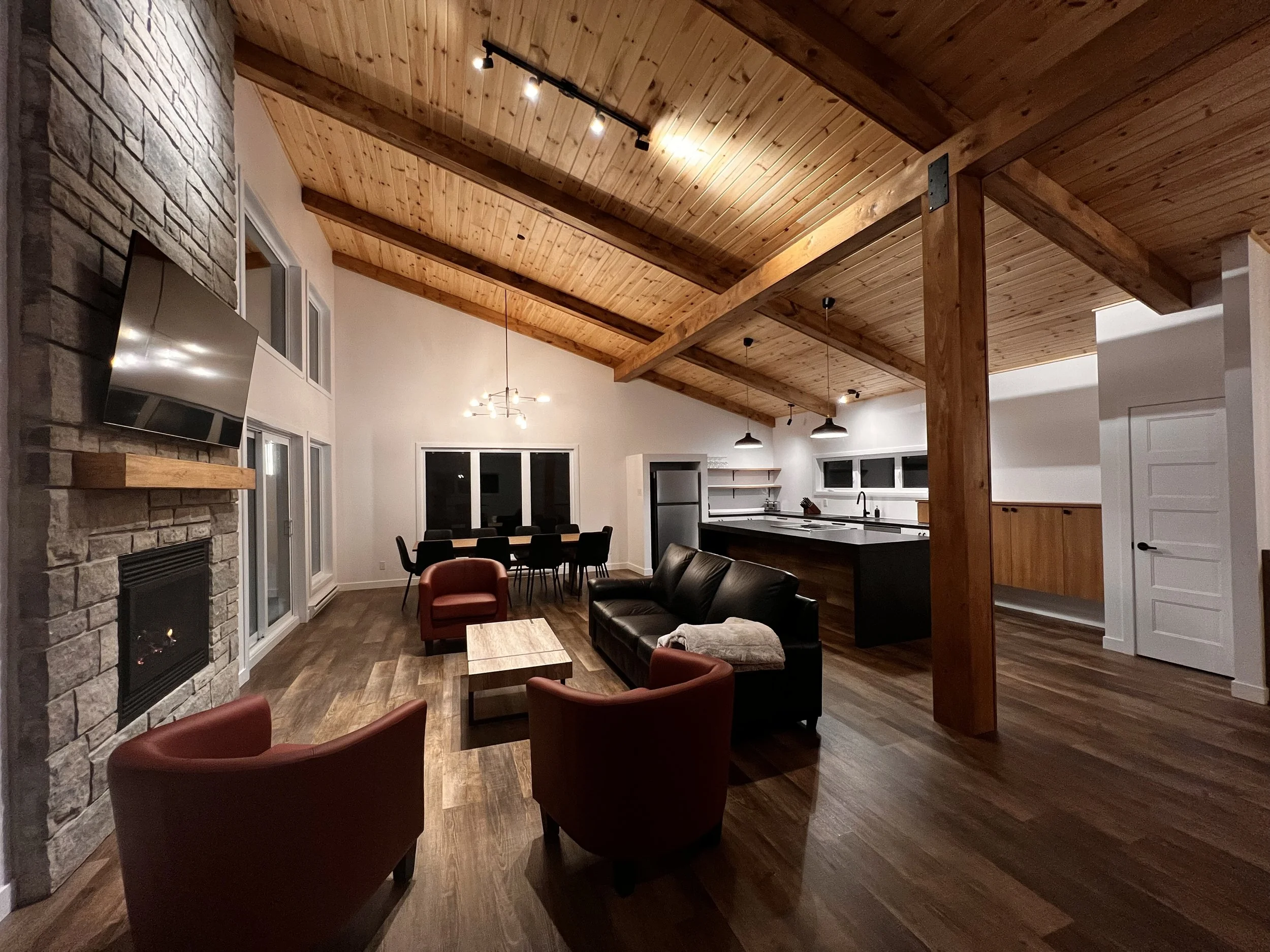Notre chalet tout neuf et spacieux offert en location est conçu pour accueillir des familles ou des groupes d’amis. Avec ses commodités modernes, il offre un espace confortable après une journée de motoneige ou de ski. Profitez d’une ambiance chaleureuse en montagnes, d’une cuisine entièrement équipée, ainsi que d’un salon où vous pourrez vous détendre devant le foyer.